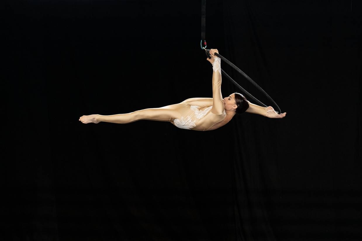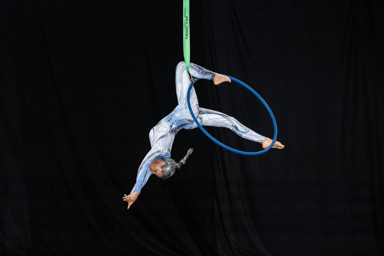 - Avec le cerceau ou le tissu aérien, l'artiste utilise l'agrès pour créer des chorégraphies intégrant des acrobaties, à la croisée de la danse et des arts du cirque contemporain.